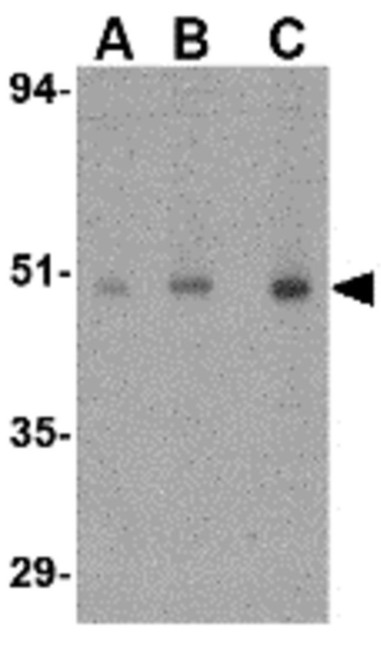 Western blot: Human ovary tissue lysate stained with ARG56837 anti-ORAI1 / CRACM1 antibody at (A) 0.5, (B) 1 and (C) 2 µg/ml dilution.