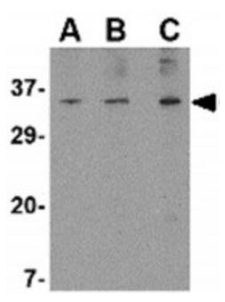 Western blot: A20 cell lysate stained with ARG56848 anti-ORAI3 antibody at (A) 1, (B) 2 and (C) 4 µg/ml dilution.