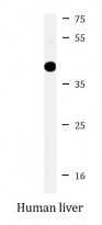 Western blot: 20 µg of Human liver lysate stained with ARG58999 anti-OTC / Ornithine Carbamoyltransferase antibody at 1:1000 dilution.
