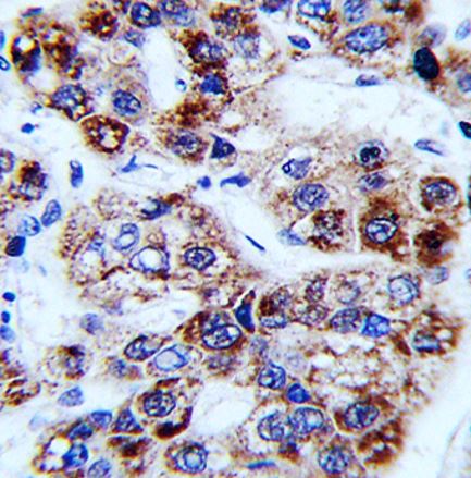 Immunohistochemistry: Formalin-fixed and paraffin-embedded Human hepatoarcinoma stained with ARG58999 anti-OTC / Ornithine Carbamoyltransferase antibody.