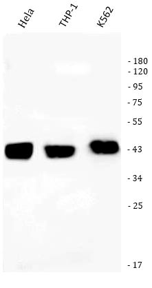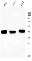 Western blot: Hela, THP-1, and K562 stained with ARG45192 anti-OTULIN antibody at 0.5 μg/ml dilution.
