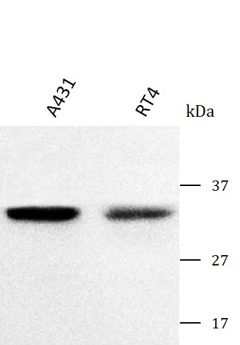 Western blot: A431 and RT4 stained with ARG43937 anti-OVOL2 antibody at 0.5 μg/mL dilution.