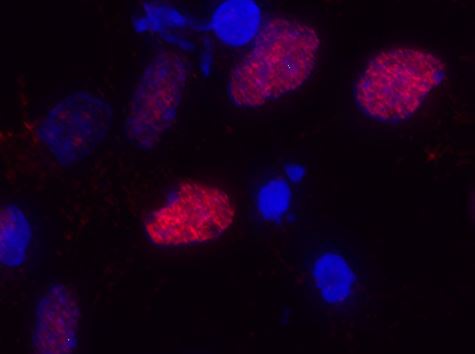 Immunofluorescence: Primary rat cortical neuroepithelial cells stained with ARG52380 anti-Olig 2 antibody (red). The cells were treated with basic FGF for 30 hours prior to staining (this induces Olig 2 expression in these primary cells).