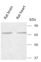 Western blot: Rat brain and Rat heart stained with ARG43969 anti-Opioid Receptor antibody at 0.5 μg/mL dilution.
