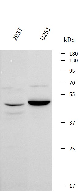 Western blot: 293T and U251 stained with ARG44447 anti-PAAF1 antibody at 0.5 μg/mL dilution.