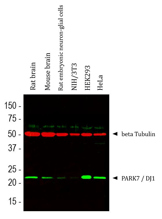 Western blot: Rat brain, Mouse brain, Rat embryonic neuron-glial cells, NIH/3T3, HEK293 and HeLa cell lysates stained with ARG11137 anti-PARK7 / DJ1 antibody (green) at 1:2000 dilution. The blot was simultaneously stained with anti-beta Tubulin antibody (red) at 1:10000 dilution.