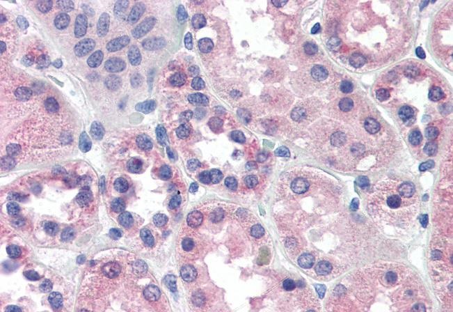 Immunohistochemistry: Paraffin-embedded Human kidney tissue. Antigen Retrieval: Steam tissue section in Citrate buffer (pH 6.0). The tissue section was stained with ARG63906 anti-PCK1 / PEPCKC antibody at 2 µg/ml dilution followed by AP-staining.