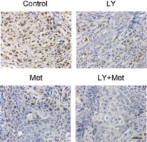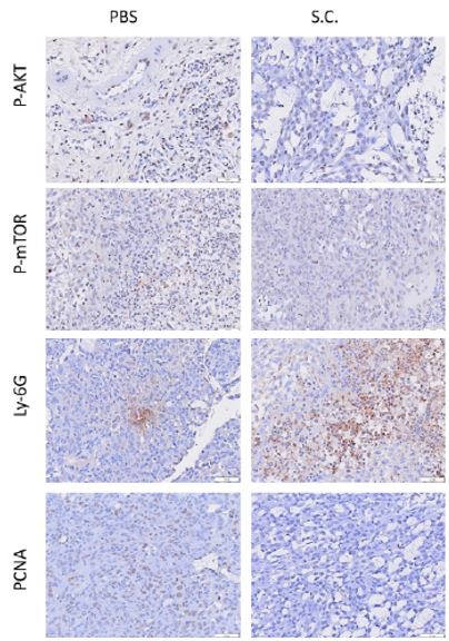 Immunohistochemistry: Mouse xenograft tumor stained with ARG22104 anti-Ly6G + Ly6C antibody [RB6-8C5] ARG40666 anti-mTOR phospho (Ser2448) antibody , ARG51558 anti-Akt phospho (Ser473) antibody and ARG62605 anti-PCNA antibody [PC10].