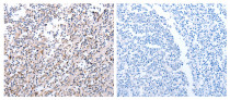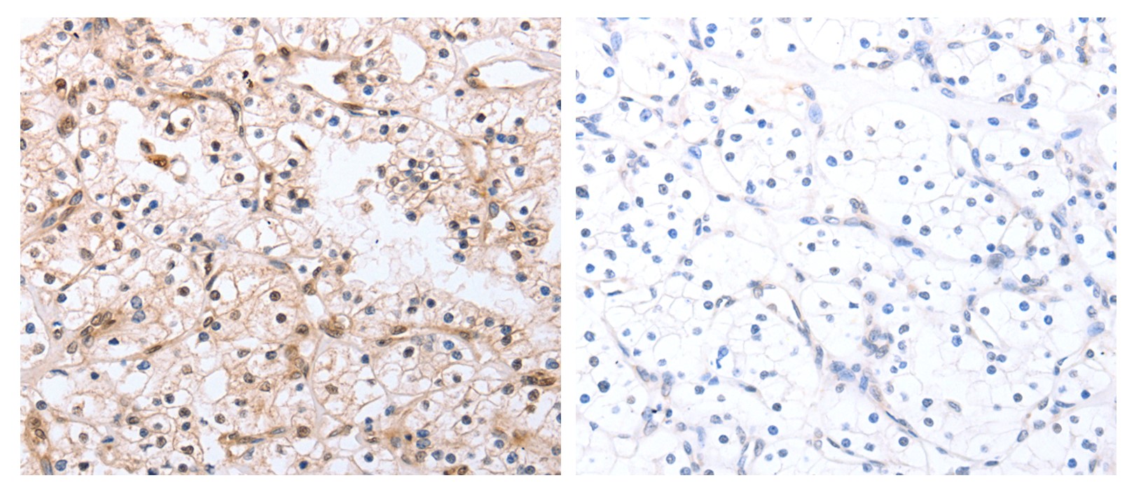 Immunohistochemistry: Paraffin-embedded Human renal cancer stained with ARG66403 anti-PDCD10 antibody (left) at 1:20 dilution, or the same antibody pre-incubated with antigen (right). (Original magnification: X200).