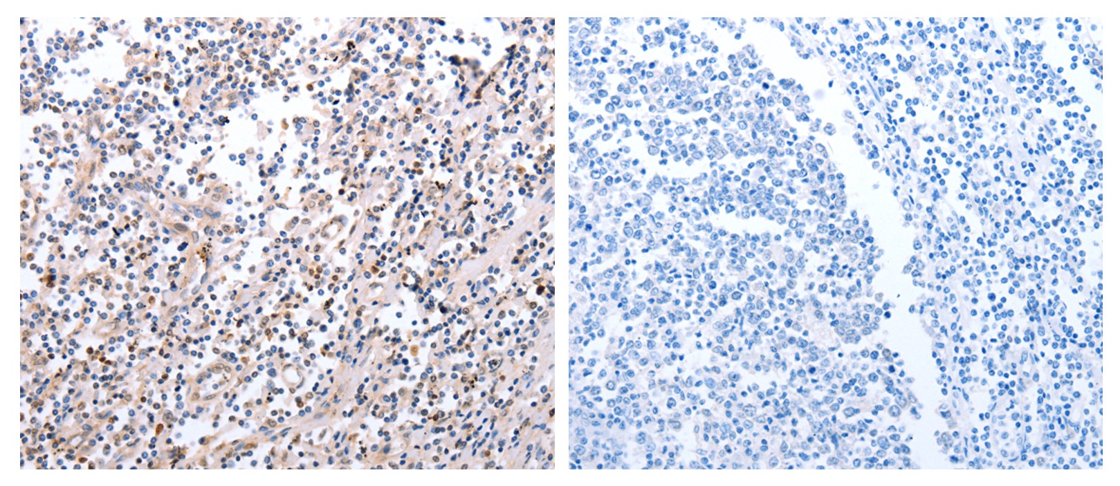 Immunohistochemistry: Paraffin-embedded Human tonsil stained with ARG66403 anti-PDCD10 antibody (left) at 1:20 dilution, or the same antibody pre-incubated with antigen (right). (Original magnification: X200).