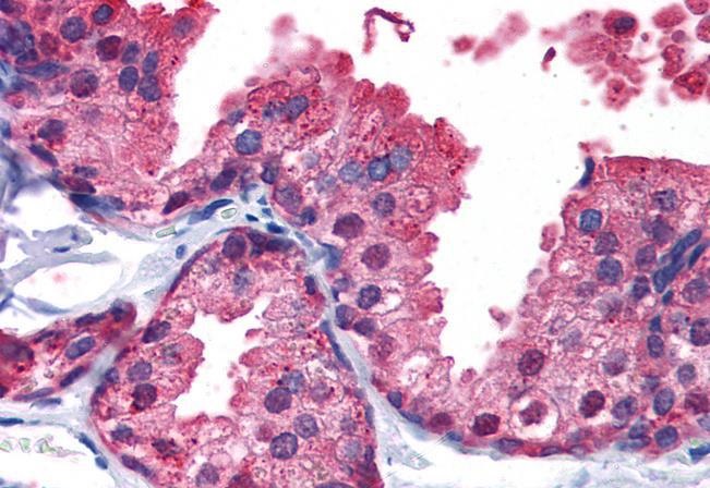 Immunohistochemistry: Paraffin-embedded Human prostate tissue. Antigen Retrieval: Steam tissue section in Citrate buffer (pH 6.0). The tissue section was stained with ARG63896 anti-PDE4B antibody at 5 µg/ml dilution followed by AP-staining.