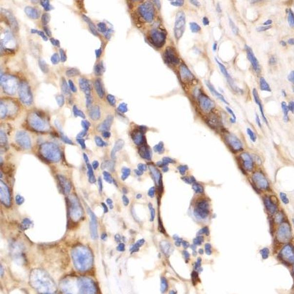 Immunohistochemistry: Human colorectal cancer stained with ARG45709 anti-PDE4DIP antibody at 2 μg/ml dilution.