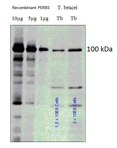| Immunogen | Synthetic multiple antigenic peptide taken within aa. 1-50 from Trypanososoma brucei PDEB1 protein. |