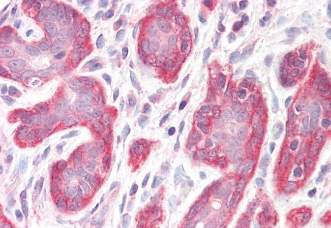 Immunohistochemistry: Paraffin-embedded Human breast tissue. Antigen Retrieval: Steam tissue section in Citrate buffer (pH 6.0). The tissue section was stained with ARG63414 anti-PDLIM4 / RIL antibody at 3.75 µg/ml dilution followed by AP-staining.
