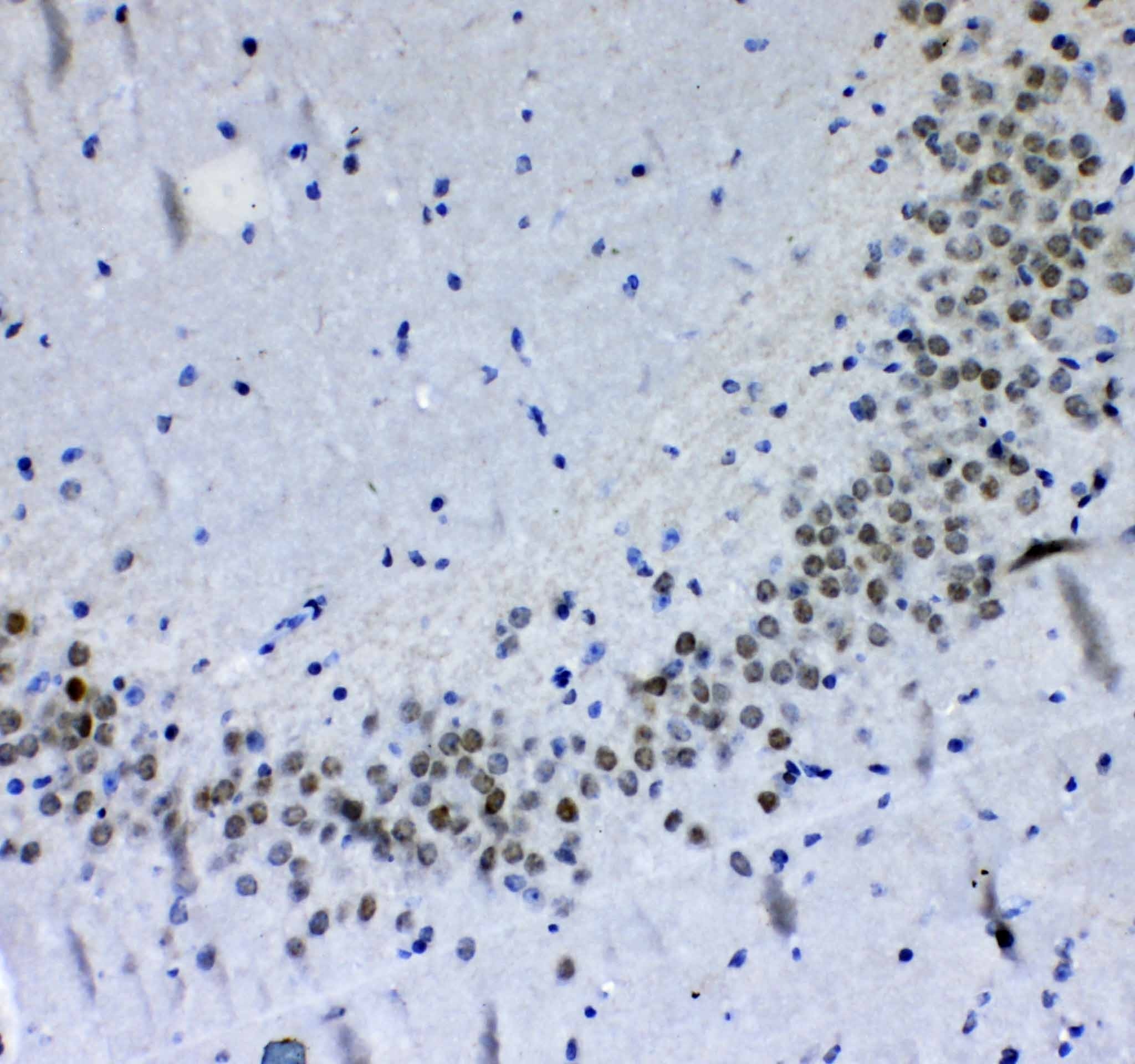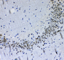 Immunohistochemistry: Paraffin-embedded Rat brain tissue. Antigen Retrieval: Heat mediated was performed in Citrate buffer (pH 6.0, epitope retrieval solution) for 20 min. The tissue section was blocked with 10% goat serum. The tissue section was then stained with ARG59012 anti-PER1 antibody at 1 µg/ml dilution, overnight at 4°C.