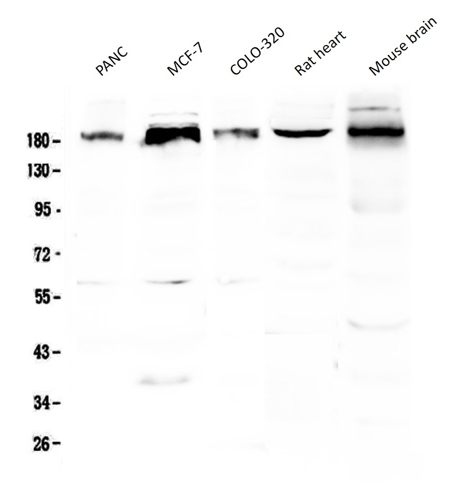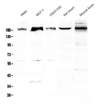 Western blot: 50 µg of samples under reducing conditions. PANC, MCF-7, COLO-320, Rat heart and Mouse brain lysates stained with ARG59012 anti-PER1 antibody at 0.5 µg/ml, overnight at 4°C.