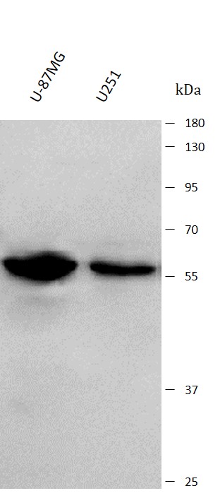 Western blot: U-87MG and U251 stained with ARG44517 anti-PHF10 antibody at 0.5 μg/mL dilution.