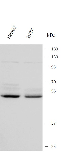 Western blot: HepG2 and 293T stained with ARG44468 anti-PI4K2B antibody at 0.5 μg/mL dilution.