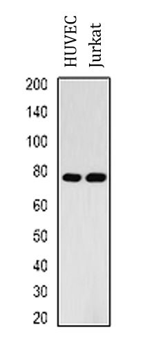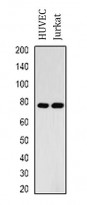 Western blot: HUVEC and Jurkat whole cell lysates stained with ARG66623 anti-PIAS1 antibody.