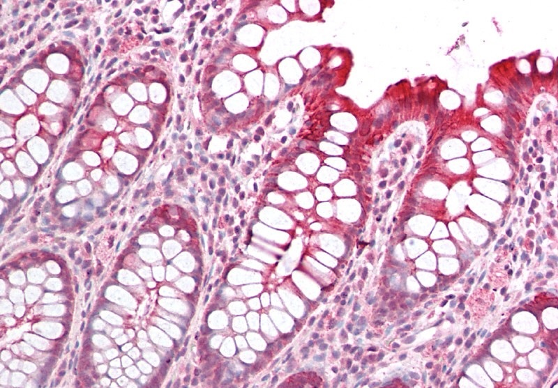 Immunohistochemistry: Paraffin-embedded Human colon tissue. Antigen Retrieval: Steam tissue section in Citrate buffer (pH 6.0). The tissue section was stained with ARG64024 anti-PICK1 antibody at 5 µg/ml dilution followed by AP-staining.