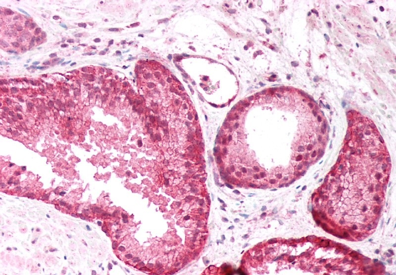 Immunohistochemistry: Paraffin-embedded Human prostate tissue. Antigen Retrieval: Steam tissue section in Citrate buffer (pH 6.0). The tissue section was stained with ARG64024 anti-PICK1 antibody at 5 µg/ml dilution followed by AP-staining.