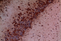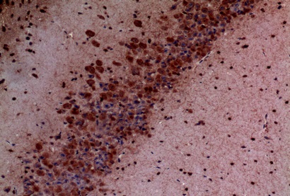 Immunohistochemistry: Paraffin-embedded Mouse brain tissue stained with ARG66641 anti-PIK3CD / p110 delta antibody at 1:100 dilution.
