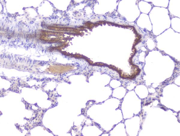 Immunohistochemistry: Paraffin-embedded Rat lung tissue. Antigen Retrieval: Heat mediation was performed in Citrate buffer (pH 6.0) for 20 min. The tissue section was blocked with 10% goat serum. The tissue section was then stained with ARG42611 anti-PKC beta I antibody at 1 µg/ml dilution, overnight at 4°C.