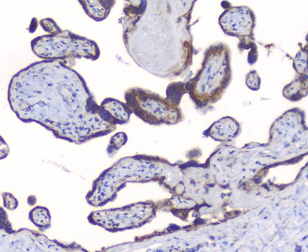 Immunohistochemistry: Paraffin-embedded Human placenta tissue. Antigen Retrieval: Heat mediation was performed in Citrate buffer (pH 6.0) for 20 min. The tissue section was blocked with 10% goat serum. The tissue section was then stained with ARG42611 anti-PKC beta I antibody at 1 µg/ml dilution, overnight at 4°C.