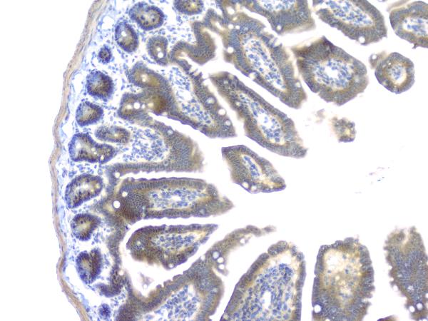 Immunohistochemistry: Paraffin-embedded Mouse small intestine tissue. Antigen Retrieval: Heat mediation was performed in Citrate buffer (pH 6.0) for 20 min. The tissue section was blocked with 10% goat serum. The tissue section was then stained with ARG42611 anti-PKC beta I antibody at 1 µg/ml dilution, overnight at 4°C.