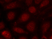 Immunofluorescence: methanol-fixed MCF7 cells stained with ARG51668 anti-PKC beta I phospho (Thr641) antibody (red).