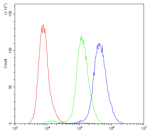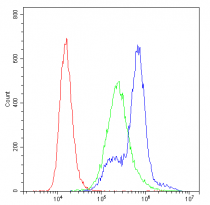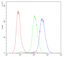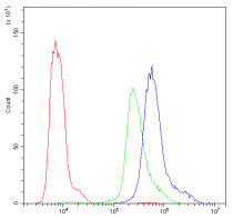 Flow Cytometry: K562 cells were blocked with 10% normal goat serum and then stained with ARG42739 anti-PKC eta antibody (blue) at 1 µg/10^6 cells for 30 min at 20°C, followed by incubation with DyLight®488 labelled secondary antibody. Isotype control antibody (green) was Rabbit IgG (1 µg/10^6 cells) used under the same conditions. Unlabelled sample (red) was also used as a control.