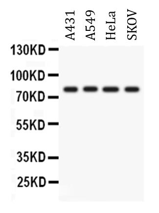Western blot: 50 µg of sample under reducing conditions. A431, A549, HeLa and SKOV whole cell lysates stained with ARG42739 anti-PKC eta antibody at 0.5 µg/ml dilution, overnight at 4°C.