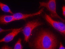 Immunofluorescence: methanol-fixed HeLa cells stained with ARG51581 anti-PKD / PKC mu phospho (Ser738) antibody.
