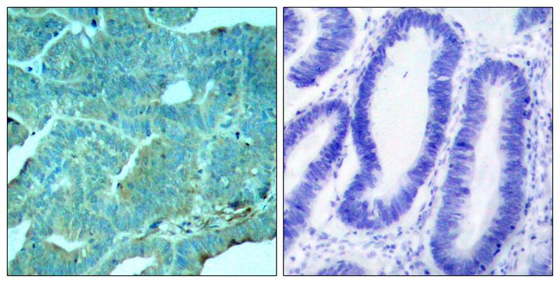 Immunohistochemistry: Paraffin-embedded Human colon carcinoma tissue stained with ARG51761 anti-PKR phospho (Thr446) antibody (left) or the same antibody preincubated with blocking peptide (right).