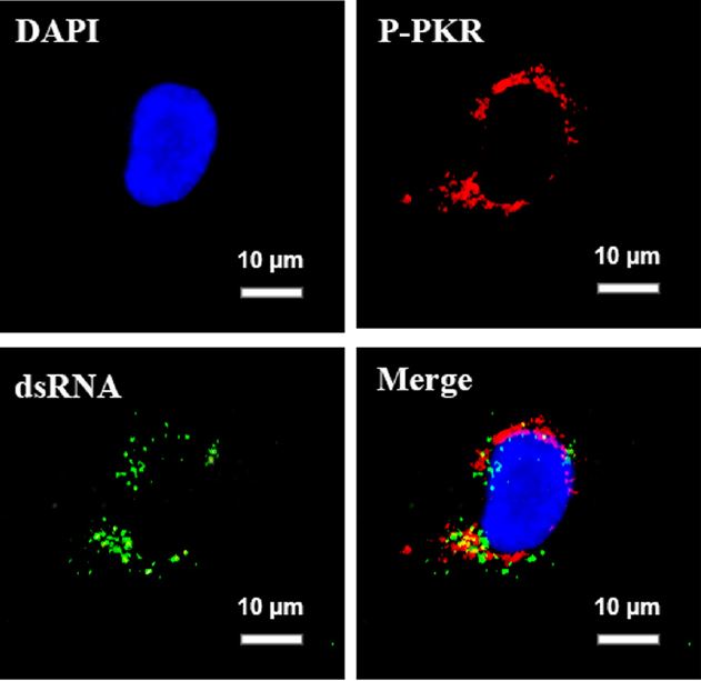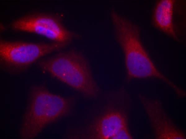 Immunofluorescence: methanol-fixed HeLa cells stained with ARG51761 anti-PKR phospho (Thr446) antibody.