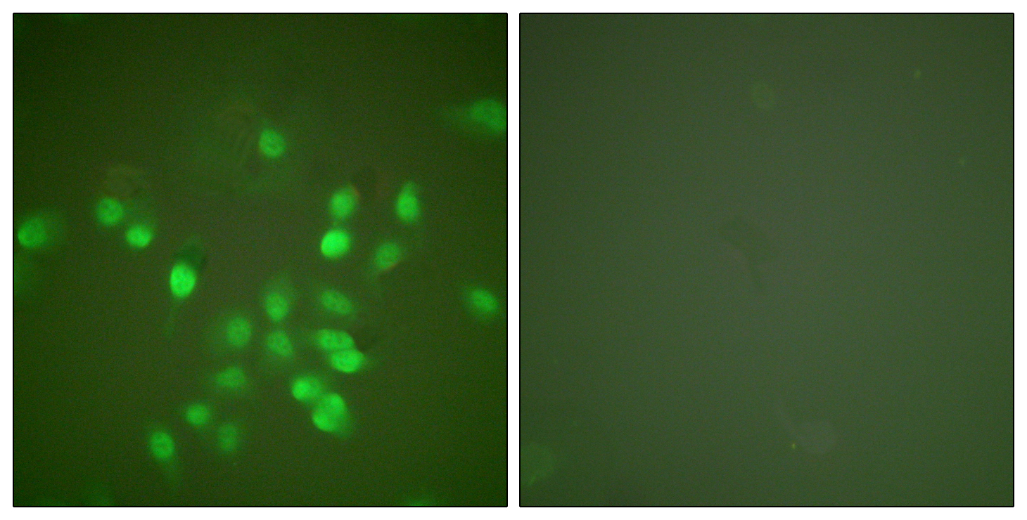 Immunofluorescence: A549 cells stained with ARG66699 anti-PML antibody. The picture on the right is blocked with the synthetic peptide.