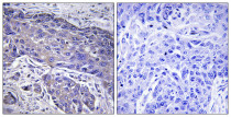 Immunohistochemistry: Paraffin-embedded Human lung carcinoma tissue stained with ARG66721 anti-POFUT1 antibody. The picture on the right is blocked with the synthetic peptide.