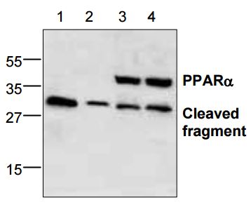 | Specificity | The antibody recognizes ~52 kDa PPARα in human sample. A ~28 kDa cleavage fragment can also be detected in samples of human, mouse, and rat origins. |