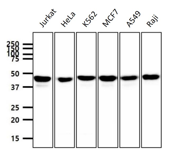 Western blot: 40 µg of Jurkat, HeLa, K562, MCF7, A549 and Raji cell lysates stained with ARG56912 anti-PPM1A antibody [p6c7] at 1:1000 dilution.
