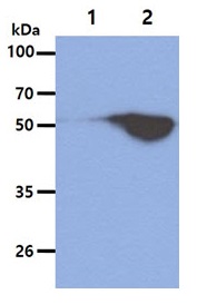 Western blot: 2 µg of 1) 293T cell lysate, 2) PPM1F Transfected 293T cell lysate stained with ARG57029 anti-PPM1F antibody [6D11] at 1:1000.
