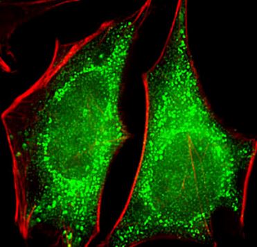 Immunofluorescence: HeLa cells stained with ARG56218 anti-PPP2R2A antibody (green) at 1:25 dilution. Cytoplasmic actin was counterstained with Alexa Fluor® 555 conjugated with Phalloidin (red).
