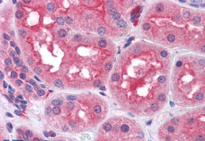 Immunohistochemistry: Paraffin embedded Human Kidney. (Steamed antigen retrieval with citrate buffer pH 6) stained with ARG63978 anti-PREP / Prolyl Endopeptidase antibody at 3.8 µg/ml dilution followed by AP-staining.