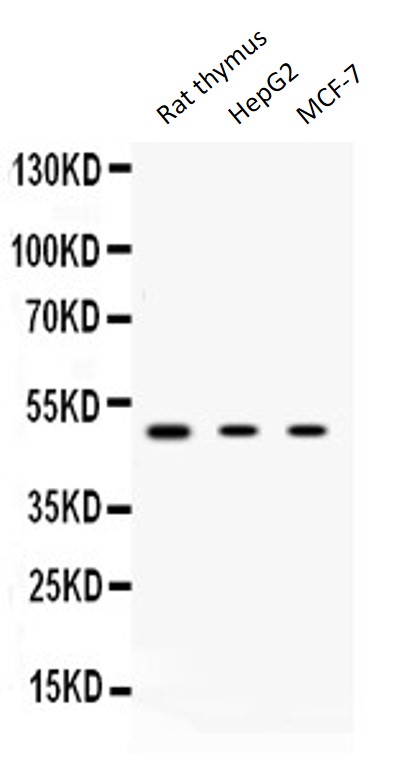 Western blot: Rat thymus, HepG2 and MCF7 lysates stained with ARG59011 anti-PRKAR1A / PKA RI alpha antibody at 0.5 µg/ml dilution.