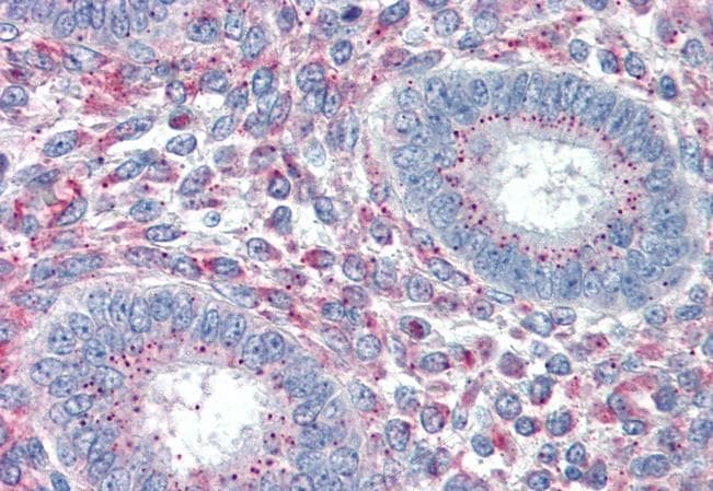 Immunohistochemistry: Paraffin-embedded Human uterus tissue. Antigen Retrieval: Steam tissue section in Citrate buffer (pH 6.0). The tissue section was stained with ARG64375 anti-PRRX1 antibody at 5 µg/ml dilution followed by AP-staining.