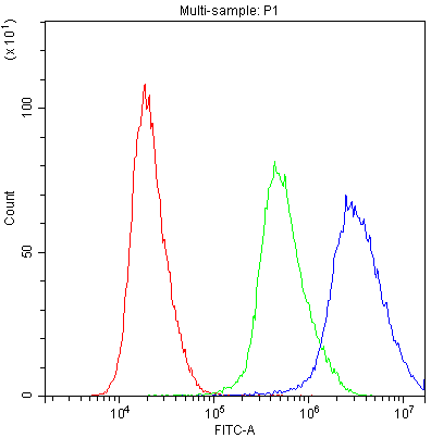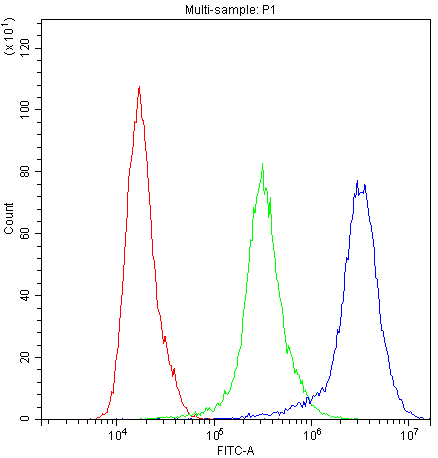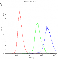 Flow Cytometry: A549 cells were blocked with 10% normal goat serum and then stained with ARG59434 anti-PRX / Periaxin antibody (blue) at 1 µg/10^6 cells for 30 min at 20°C, followed by DyLight®488 labelled secondary antibody. Isotype control antibody (green) was rabbit IgG (1 µg/10^6 cells) used under the same conditions. Unlabelled sample (red) was also used as a control.