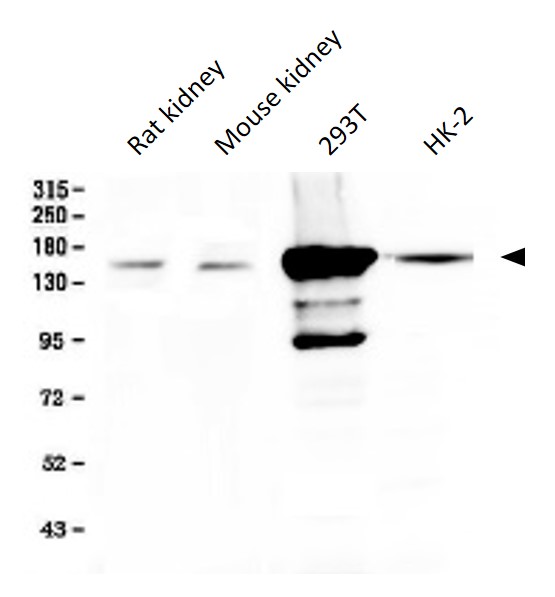 Western blot: 50 µg of samples under reducing conditions. Rat kidney, Mouse kidney, 293T and HK-2 whole cell lysates stained with ARG59434 anti-PRX / Periaxin antibody at 0.5 µg/ml, overnight at 4°C.