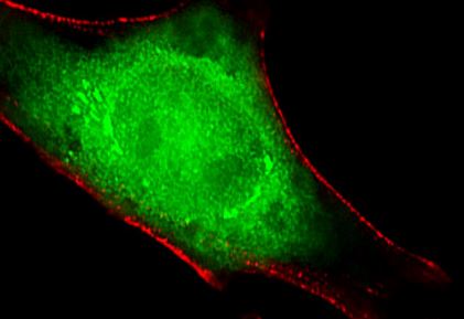 Immunofluorescence: HeLa cells stained with ARG55764 anti-PSMC1 antibody (green) at 1:25 dilution. Cytoplasmic actin was counterstained with Alexa Fluor® 555 conjugated with Phalloidin (red).