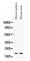 Western blot: 50 µg of samples under reducing conditions. Mouse spleen and Mouse liver lysates stained with ARG40991 anti-Peptide YY antibody at 0.5 µg/ml, overnight at 4°C.