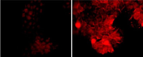 Immunofluorescence: Control (left) and calyculin A-treated (right) A431 cells were stained with ARG23898 anti-Phosphoserine / threonine antibody.