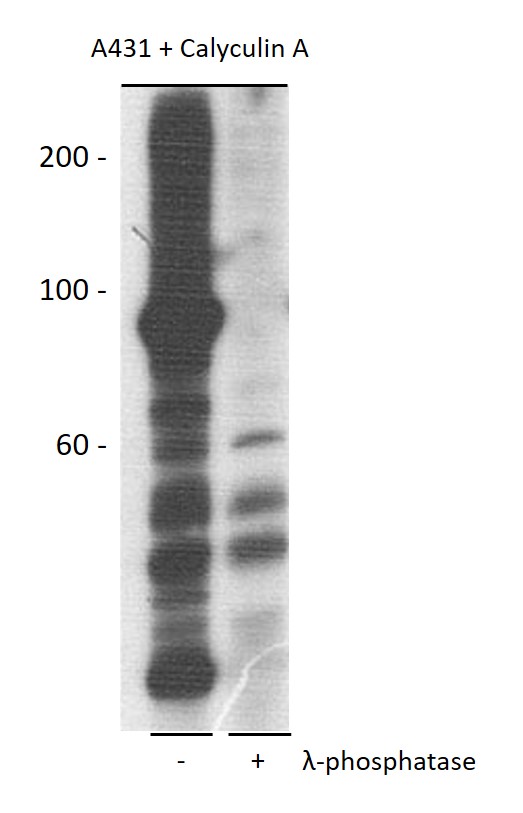 Western blot: A431 cells treated with calyculin A (100 nM) for 30 min (lane 1) then treated with lambda phosphatase (lane 2). The blot was stained with ARG23898 anti-Phosphoserine / threonine antibody at 1:1000 dilution.
